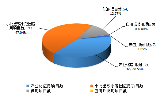 在所登记的423项应用技术成果中,产业化应用项目数163项,占所登记应用技术成果的38.53%;小批量或小范围应用项目数199项,占所登记应用技术成果的47.04%;试用项目数54项,占所登记应用技术成果的12.77%;应用后停用项目数0项,占所登记应用技术成果的0.00%;未应用项目数7项,占所登记应用技术成果的1.65%。