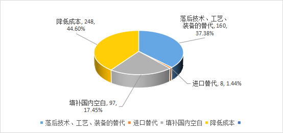 在所登记的应用技术成果中转化项目数共有74项,共产生428项实际应用效果,其中:落后技术、工艺、装备的替代160项,占37.38%;进口替代4项,占0.93%;填补国内空白93项,占21.73%;降低成本171项,占39.95%。