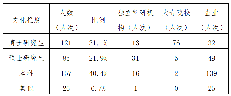 | 年龄结构 | 人数 (人次) | 比例 | 独立科研机构(人次) | 大专院校(人次) | 企业 (人次) |