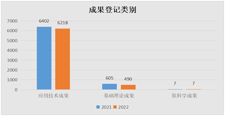 2022年度登记科技成果共6715项,比2021年减少了299项,减少4.26%。其中应用技术成果6218项,占成果总数的92.60%,比2021年减少了184项;基础理论成果490项,占成果总数的7.30%,比2021年减少了115项;软科学成果7项,占成果总数的0.1%,和2021年持平。(见图1)