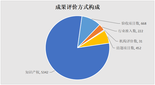 科技成果评价方式以知识产权、验收项目为主,结题、行业准入、机构评价为辅。在登记的6715项科技成果中,以知识产权体现的成果5342项,占登记成果总数的79.6%;以验收形式体现的成果为668项,占全年登记成果总数的9.95%;以结题形式体现的成果452项,占登记成果总数的6.73%;以行业准入形式体现的成果222项,占登记成果总数的3.30%;以机构评价形式体现的成果31项,占登记成果总数的0.46%。(见图2)