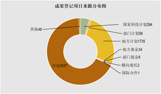 任务来源情况:2022年科技成果以各完成单位自选项目为主,自选项目成果4537项,占成果总数的67.57%,各级财政计划项目共2127项,其中:国家计划项目294项,国家级部门计划项目56项,国家级部门基金项目8项,地方计划项目成果1735项,地方基金34项。其他为横向委托项目成果2项,国际合作项目1项,其他项目成果48项。(见图3)