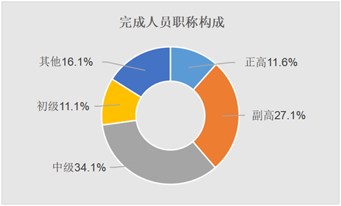 1.技术职称:在登记的6715项科技成果主要完成人员中,正高职称(含院士)人员5232人,占11.6%;副高职称人员12261人,占27.1%;中级职称人员15426人,占34.1%;初级职称人员5020人,占11.1%;其他人员7270人,占16.1%。2022年度,在成果完成人员中,高级职称共有17493人次,占38.7%。(见图6)
