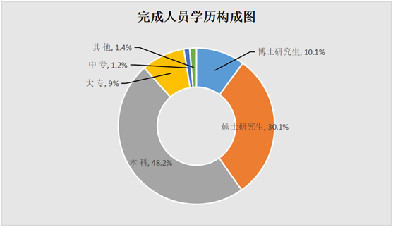 2.文化程度:在成果完成人45209中,具有硕士、博士学历人员占比较大。在登记的6715项科技成果主要完成人员当中,博士4561人,占10.1%;硕士13616人,占30.1%;大学本科21783人,占48.2%;大专4073人,占9.0%;中专543人,占1.2%;其他633人,占1.4%。2022年,具有博士、硕士学位共有18177人次,占40.2%。(见图7)