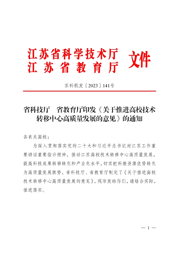 江苏|《关于推进高校技术转移中心高质量发展的意见》的通知