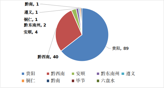 从科技成果登记的区域看,贵阳市89项,较上年增长23.6%,占登记成果总数的64.5%;黔西南州40项,较上年增长25.0%,占登记成果总数的30%;安顺市、黔东南州、遵义市、铜仁市、黔南州依次为4项、2项、1项、1项、1项。(见图1)