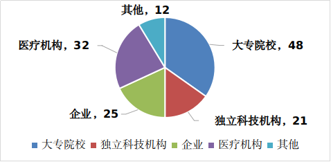 从科技成果登记的完成单位看,医疗机构、独立科研机构均较上年有大幅提升,其中,医疗机构登记32项,较上年增加24项,增长3倍;独立科研机构登记21项,较上年增加5项,增长31.3%。大专院校、企业登记成果数下降明显,其中,大专院校48项,较上年减少33项;企业25项,较上年减少19项。其他单位登记12项,较上年减少10项。(见图2)
