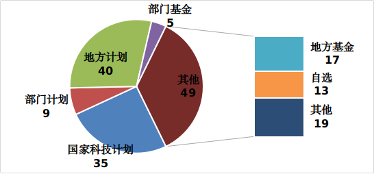 登记的138项科技成果中,以各级政府计划和基金项目产生的成果为主,合计106项,占登记成果总数的76.8%。其中,国家科技计划35项、部门计划9项、地方计划40项、部门基金5项、地方基金17项,地方计划、地方基金项目分别较上年增长5.3%、1.4倍。自选项目13项、其他项目19项。(见图3)
