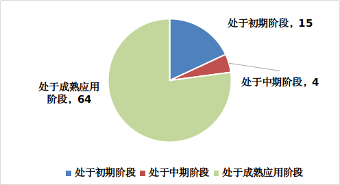 登记的83项应用技术成果中,处于实验室、小试等初期阶段的成果15项,占应用技术成果的18.1%;处于中试或设备的样机、试样等中期阶段的成果4项,占应用技术成果的4.8%;处于成熟应用阶段的成果64项,占应用技术成果的77.1%。(见图10)