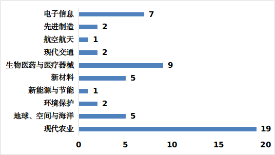 登记的83项应用技术成果中,属于高新技术领域的53项,占应用技术成果的63.9%。其中,电子信息7项,先进制造2项,航空航天1项,现代交通2项,生物医药与医疗器械9项,新材料5项,新能源与节能1项,环境保护2项,地球、空间与海洋5项,现代农业19项。(见图11)