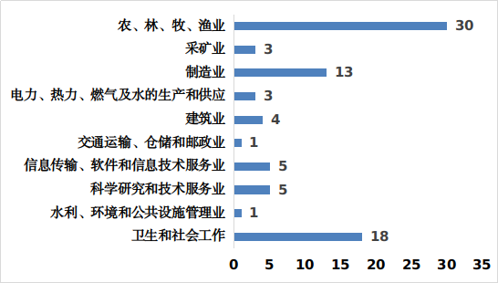 按技术成果实际推广应用的行业分类进行统计,农、林、牧、渔业30项,采矿业3项,制造业13项,电力、热力、燃气及水的生产和供应3项,建筑业4项,交通运输、仓储和邮政业1项,信息传输、软件和信息技术服务业5项,科学研究和技术服务业5项,水利、环境和公共设施管理业1项,卫生和社会工作18项。(见图12)