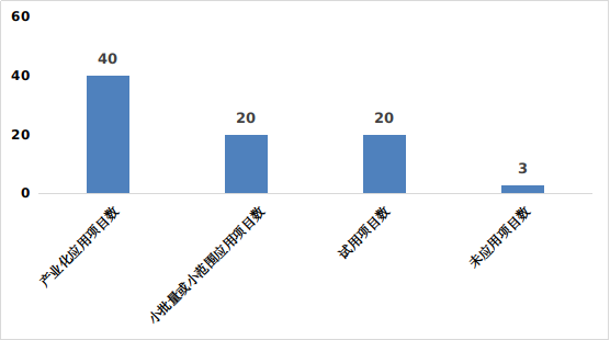 在所登记的83项应用技术成果中,产业化应用项目数40项,占应用技术成果的48.2%;小批量或小范围应用项目数20项,占应用技术成果的24.1%;试用项目数20项,占所登记应用技术成果的24.1%;未应用项目数3项,占应用技术成果的3.6%。(见图13)